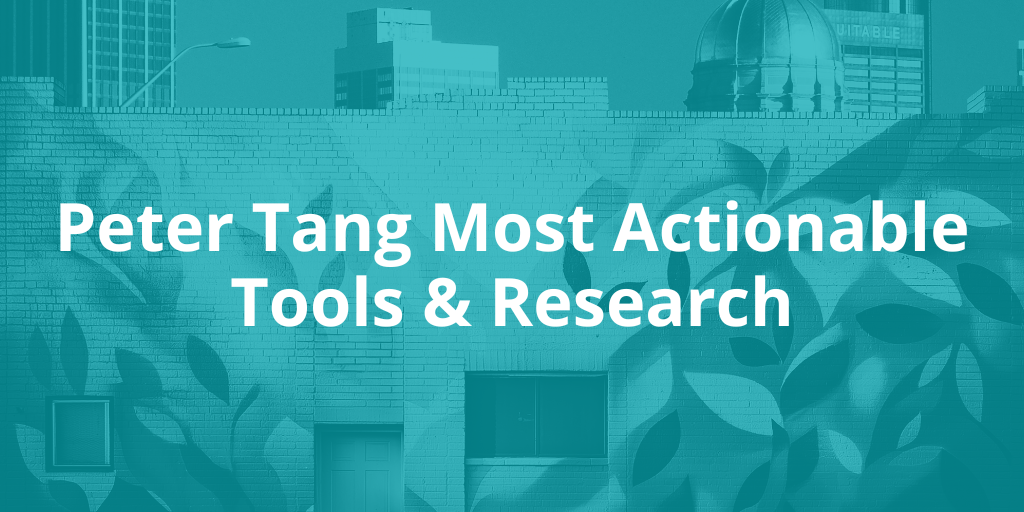The text "Peter Tang Most Actionable Tools & Research" is centered over the image. Image background shows an artistic mural with the Atlanta skyline in the background.